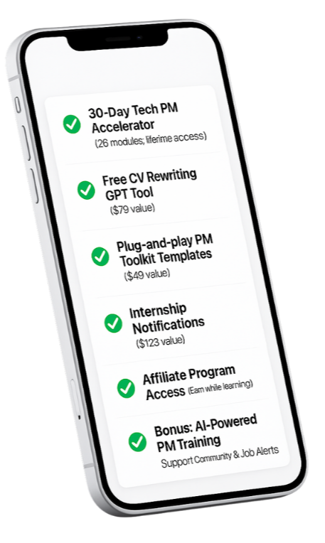 - 30-Day Tech PM Accelerator (26 modules, lifetime access)